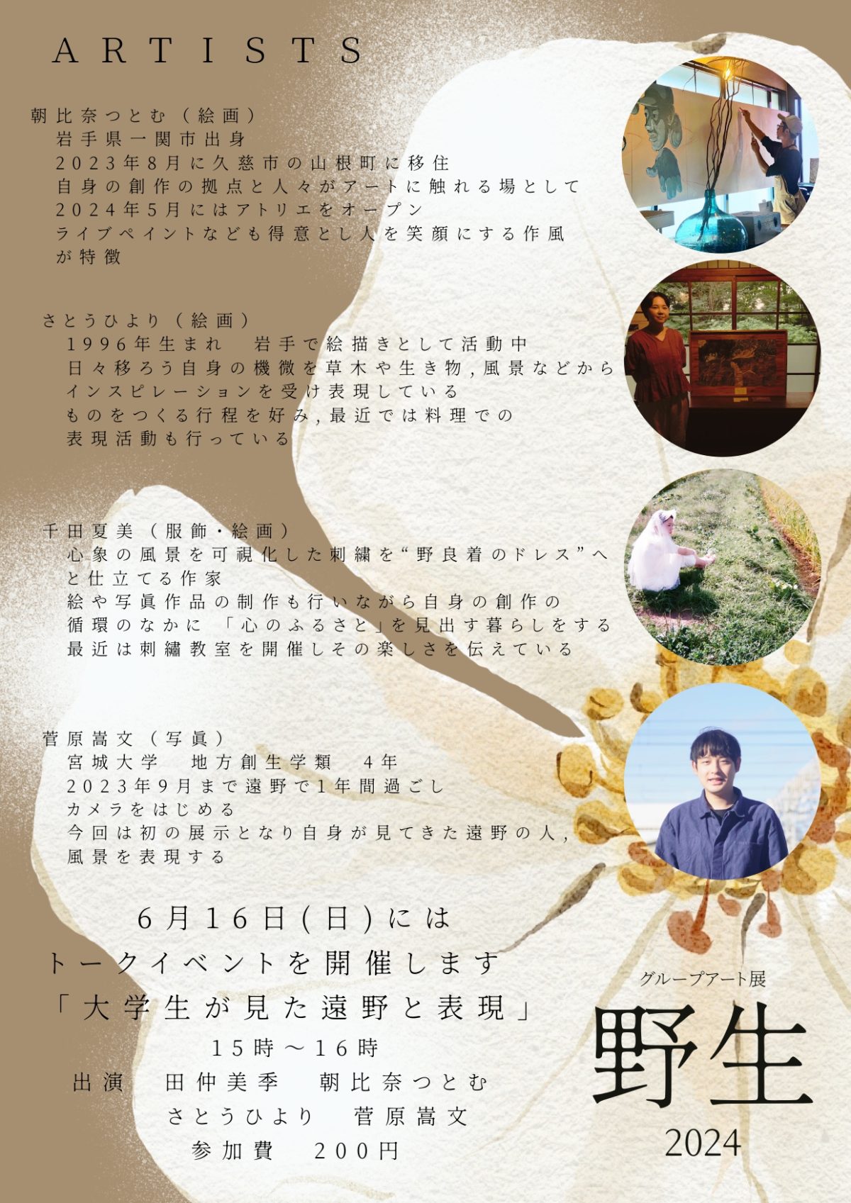 - 参加アーティスト:画家 朝比奈つとむ、画家 さとうひより、陶芸家 今野陽介、写真家 飯塚麻美、作家 千田夏美、造形家 千葉安里、研究者 森内こゆき